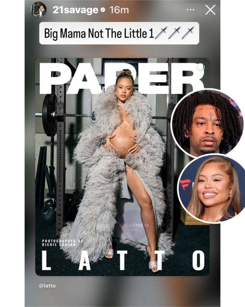 Shortly after the announcement, 21 Savage took to Instagram Stories to share Latto’s PAPER Magazine cover, captioning it “Big Mama, not the little one,” a message that signaled his support during her pregnancy. The post quickly circulated online, with fans interpreting it as confirmation of his connection to the news.