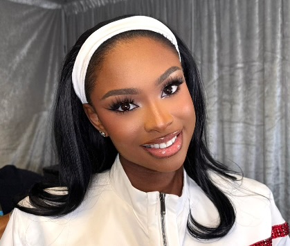 Her makeup leaned into neutral tones reminiscent of the era: soft, glowing skin, subtle shimmer, and carefully applied drugstore lashes that gave her eyes definition under the stadium lights without overpowering the rest of her look. The result was a refined take on “fine girl beauty” that nodded to the timeless face of ’90s R&B performers while staying rooted in a modern aesthetic.