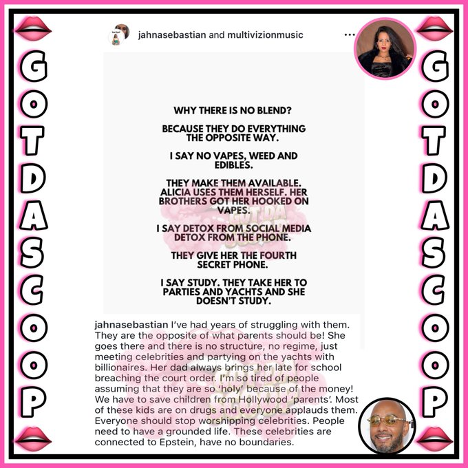 Jahna, who shares a 17-year-old daughter named Nicole with Swizz Beatz, posted multiple messages on Instagram describing what she believes happened during the teenager’s visits with the couple. According to Jahna, Nicole was exposed to vaping and drugs while staying with her father and Alicia Keys during the holidays in the United States.