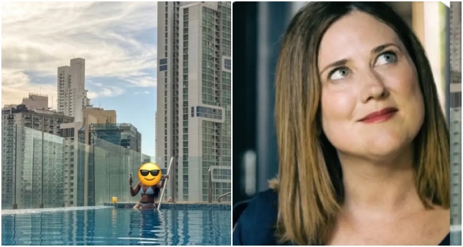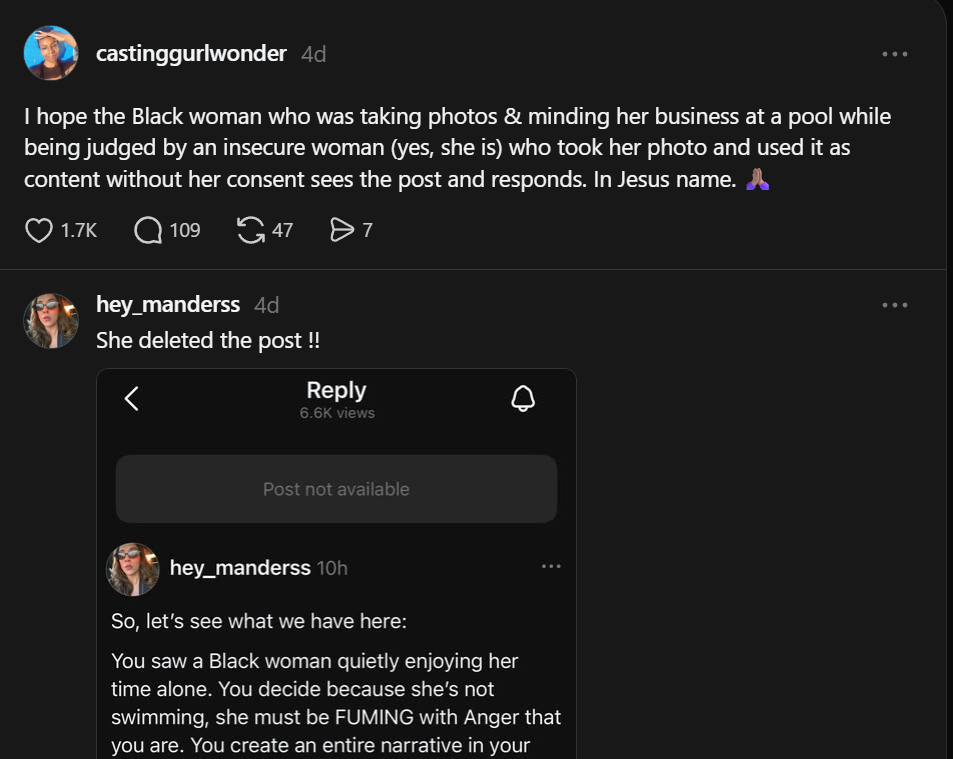 Sharon O’Dea targeted a bikini-clad Black woman taking selfies on the steps of a rooftop infinity pool with a stunning skyline in the background. (Photos/ Threads)