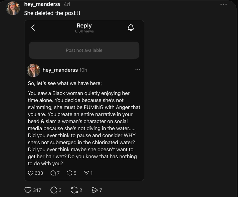 A social media post criticizing a Black woman relaxing poolside at a luxury hotel backfired, prompting the woman who made the critical post to quickly and quietly delete it.