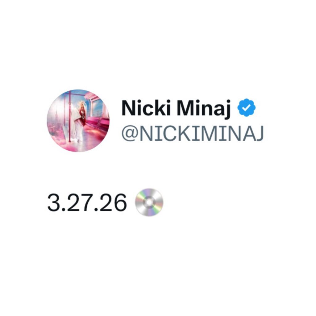 After being absent for a while, she returned to X (formerly known as Twitter) and shared: “3.27.26 [disk emoji].” This prompted the Barbz, her dedicated fanbase, to set social media ablaze.