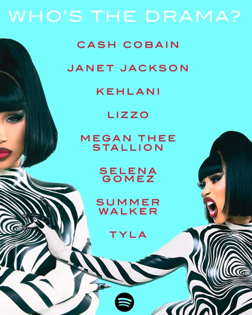 On Instagram, Cardi built excitement by asking fans, “WHO ELSE IS THE DRAMA?” before revealing the impressive lineup of eight featured artists on her new album: Cash Cobain, Janet Jackson, Kehlani, Lizzo, Megan Thee Stallion, Selena Gomez, Summer Walker, and Tyla. She announced these names on Spotify billboards in Los Angeles and Miami, ensuring that everyone knows she means business.
