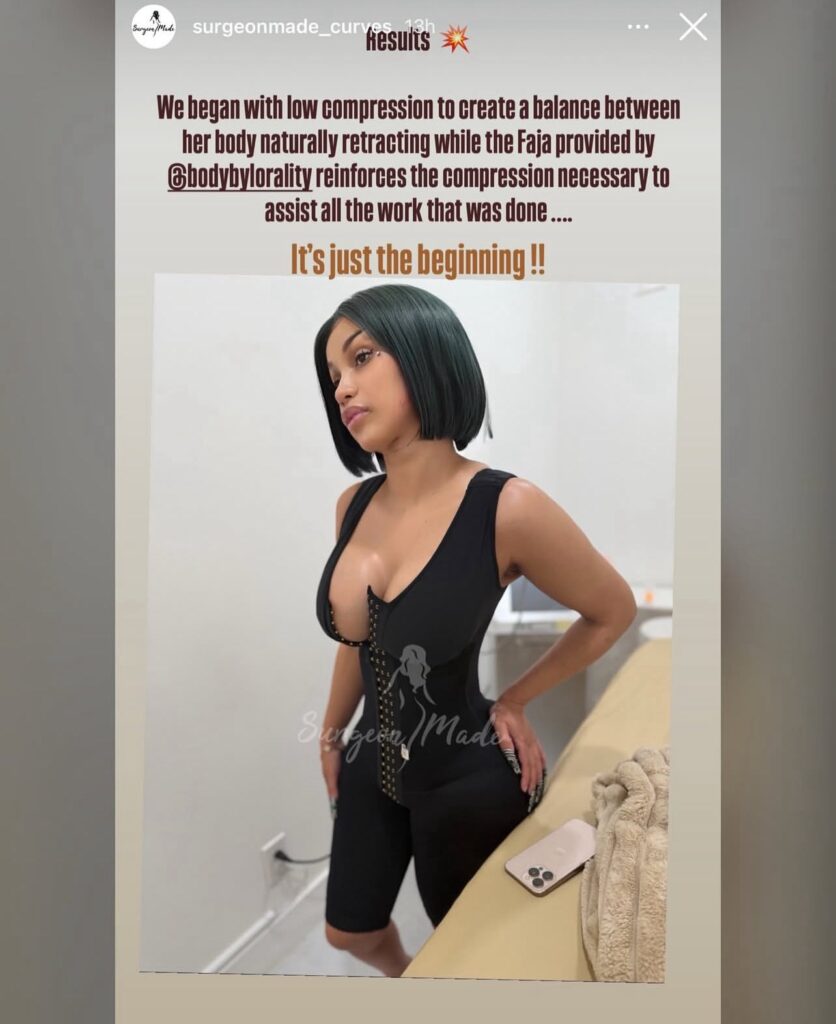 Even in her recovery phase, Cardi B looked glamorous, sporting sleek dark hair and full makeup. The clinic behind the faja shared their approach, saying: “We began with low compression to create a balance between her body naturally retracting while the Faja provided by @bodybylorality reinforces the compression necessary to assist all the work that was done… It’s just the beginning!!”