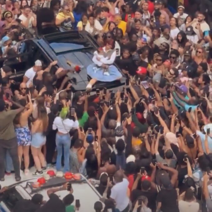 In the middle of this album promo whirlwind, Cardi has been making her presence felt all over NYC. At a pop-up in Washington Heights, she even climbed atop a black SUV to get the crowd hyped, showcasing her famous twerking skills while dressed in a gray sweater and blue skirt, creating an atmosphere reminiscent of Summer Jam.