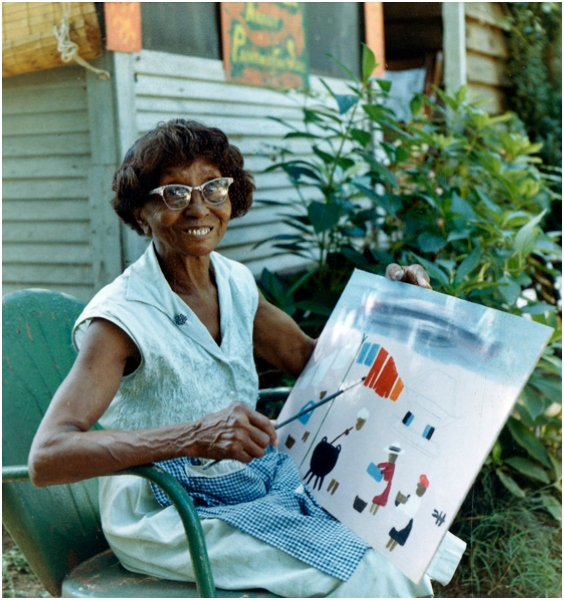 She never had formal schooling or artistic training and did not begin painting until her fifties, when paints left behind by a guest inspired her first piece — a depiction of a baptism drawn on a discarded window shade.