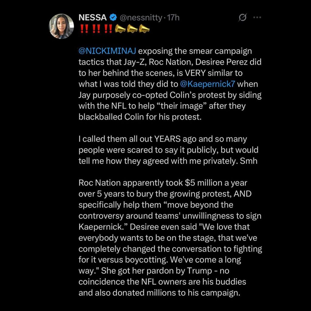 “@NICKIMINAJ exposing the smear campaign tactics that Jay Z, Roc Nation, Desiree Perez did to her behind the scenes is VERY similar to what I was told they did to @Kaepernick7,” Nessa wrote.
