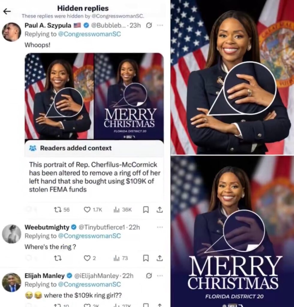 In a festive post shared on X, the congresswoman reused that same official portrait. But this time, the ring was gone. Her left hand appeared bare. Within hours, online sleuths began comparing images, and the internet did what it does best. A community note soon appeared, bluntly stating that the image had been altered to remove a ring allegedly purchased with stolen FEMA funds.