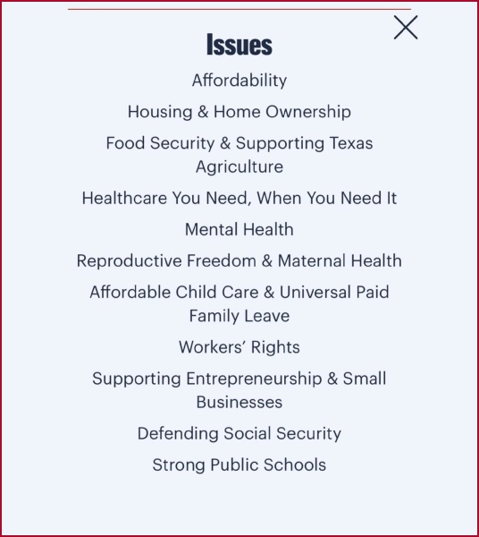 The list addresses both national concerns—such as immigration reform, broadband connectivity, and foreign policy—and core Texas voter priorities like housing affordability, food security, supporting public schools, and reproductive freedom.