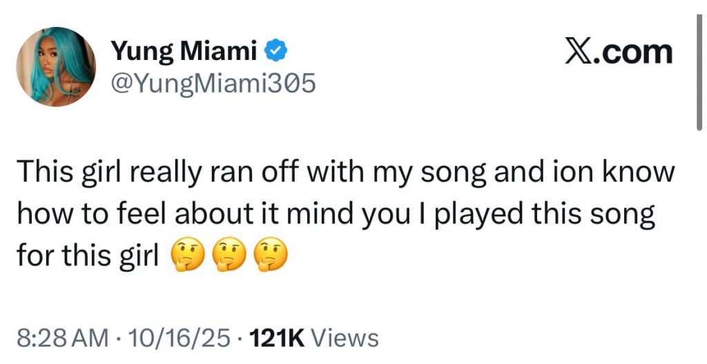 She took to X to express her frustration with a bold statement: “This girl really ran off with my song and ion know how to feel about it, mind you, I played this song for this girl,” she tweeted.