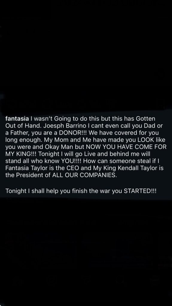 Fantasia responded in a now-deleted Instagram post. The singer shared her father’s mugshot and directly addressed his accusations. “I wasn’t Going to do this, but this has Gotten Out of Hand,” she wrote. “I can’t even call you Dad or a Father, you are a DONOR!!!” She stated that she and her mother had long covered for him and accused him of coming after her husband. Fantasia made it clear she stands by Kendall, writing that she is the CEO and Kendall is the president of all their companies, questioning how money could be stolen under that structure.