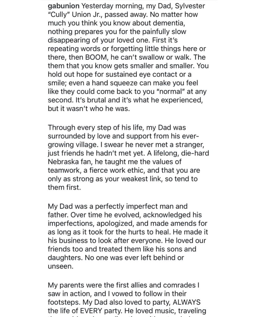 Actress Gabrielle Union is mourning the loss of her father, Sylvester “Cully” Union Jr., sharing a deeply personal and emotional tribute that seems to be touching many for its candid portrayal of grief and the realities of dementia.