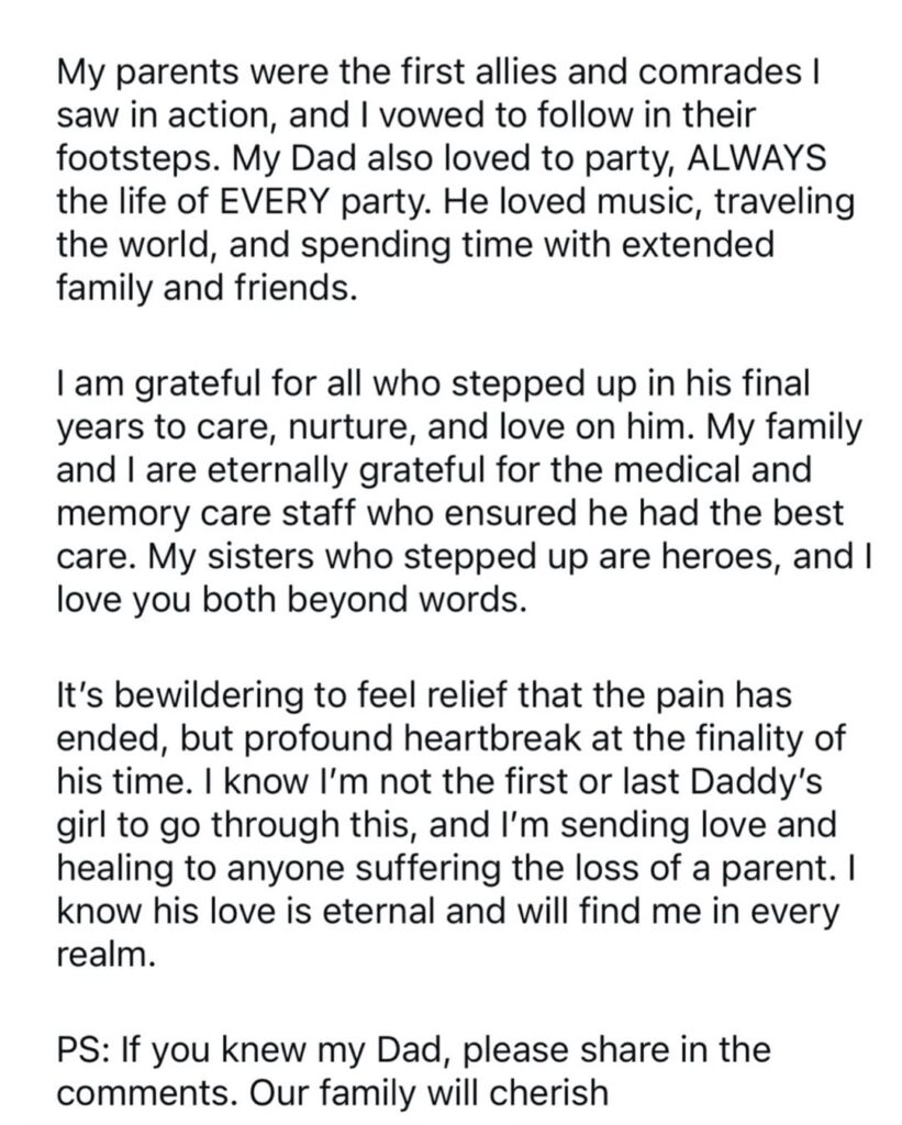 She expressed gratitude for the caregivers, family members, and memory care staff who supported her father, acknowledging their role in preserving his dignity and comfort in his final years. At the same time, she candidly addressed the conflicting emotions that follow such a loss, including a sense of relief that his suffering had ended.