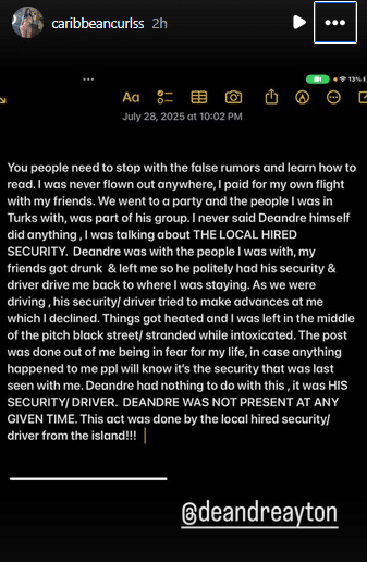 The woman, known online as @CaribbeanCurlss, had the internet in a frenzy after she posted a cryptic Instagram story claiming, “@deandreayton security left me outside in the middle of nowhere in Turks and Caicos bc I won’t have sex with him.”
