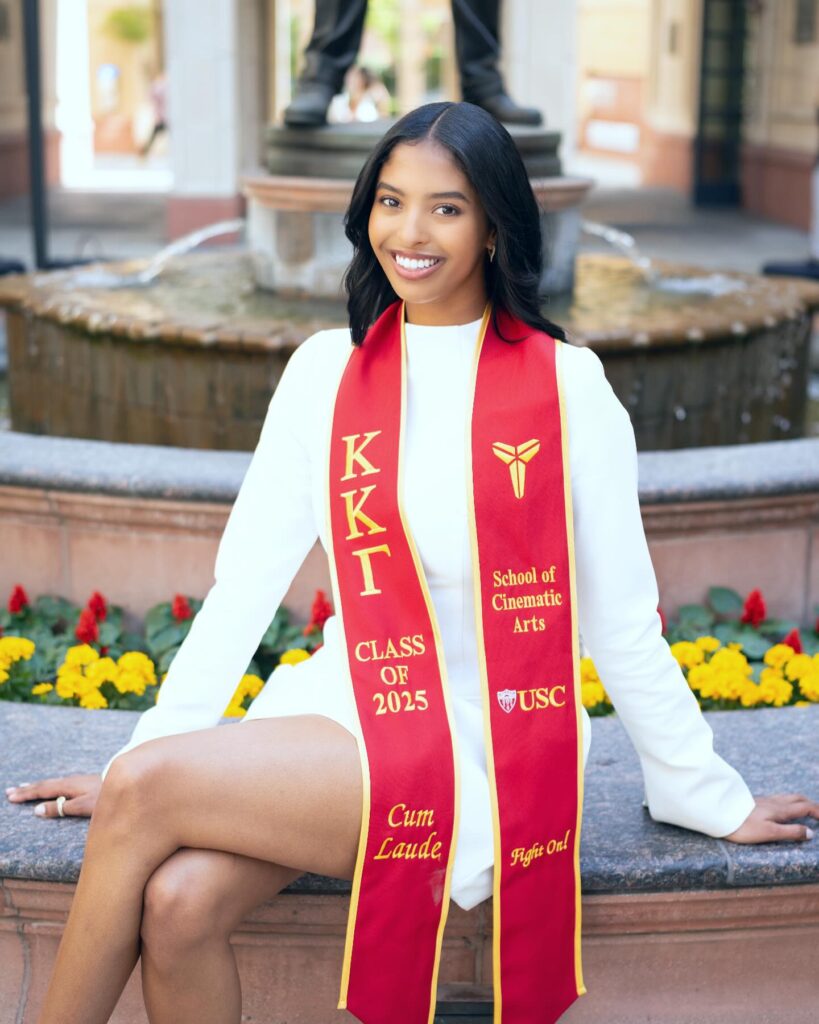 But the sweetest tribute to her late father? Natalia made sure Kobe was right there with her in spirit. Her cardinal red and gold stole wasn’t just adorned with her sorority letters and “Class of 2025”; it also featured Kobe’s iconic “Sheath” logo. This symbol, made up of those distinctive mirrored quadrilateral trapezoids, was placed right above “School of Cinematic Arts,” “USC,” and the Trojans’ rallying cry, “Fight On!” Talk about an academic slam dunk with a touching personal touch!