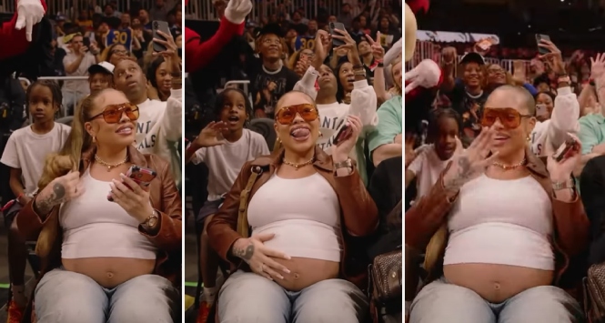 Latto was joined by her sister, Brooklyn Nikole, as the pair posed for photos shared by the Hawks on social media. In the images, Latto’s baby bump was visible beneath a white top as she stood courtside. The two also shared a moment with the team’s mascot, Harry the Hawk, during the game.