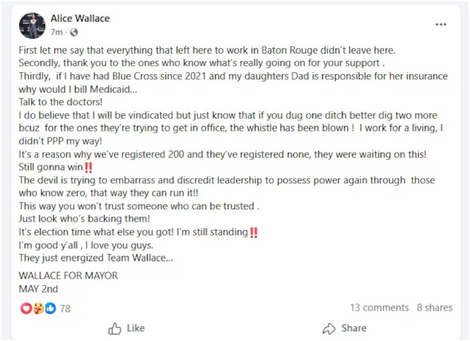 Winnsboro Mayor Alice Wallace has been arrested and charged in connection with an alleged Medicaid fraud scheme totaling approximately $75,000, according to officials from the Louisiana Bureau of Investigation.