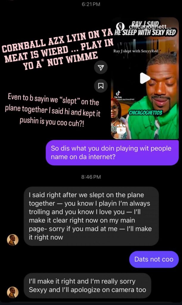 But for Sexyy Red, that wasn’t quite enough. She also posted private messages directly confronting Ray J. “Even to b sayin’ we ‘slept’ on the plane together, I said hi and kept it pushin’ is you coo uh?! So dis what you doin’ playing with people name on da internet?” she wrote, clearly still irritated by his behavior.