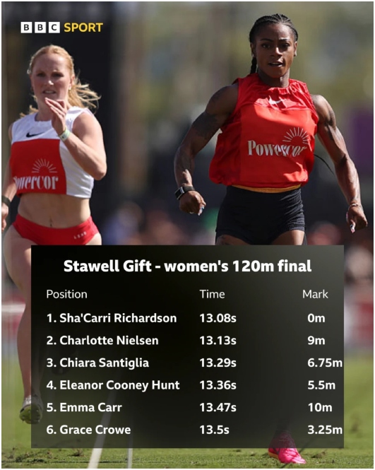Making her debut in the 148-year-old Australian event, the 26-year-old Richardson started from the ‘scratch’ mark, meaning she had to run the full 120 meters and overtake the entire field. She edged out 19-year-old Australian Charlotte Nielsen in the closing stages to claim the win, clocking a time of 13.08 seconds—the fastest women’s time in Stawell Gift history.