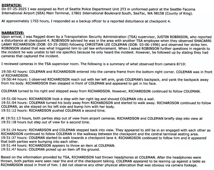 Witnesses and security footage confirmed what many suspected: the argument wasn’t just verbal. Richardson allegedly shoved Coleman multiple times as he tried to walk away, even sending him tumbling into a column. And that’s not all, authorities say she threw a pair of headphones at him, too.