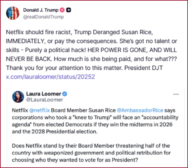 In response, Trump labeled Rice “racist” and questioned her qualifications, also implying his administration could influence regulatory decisions affecting Netflix. His comments arrived at a sensitive time, as the company reportedly seeks government approval for a potential merger with Warner Bros.