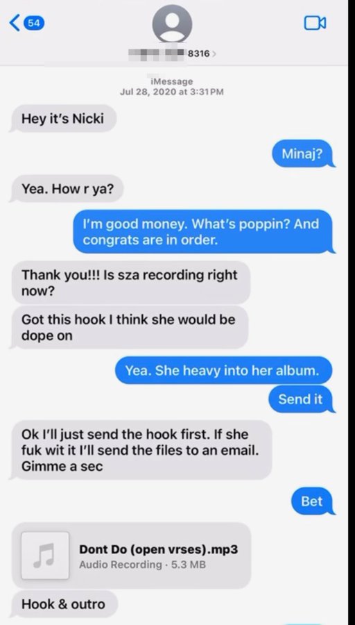 To back it all up, SZA posted a screenshot of what appeared to be Nicki reaching out via a mutual contact to collab on a track. In the message, Nicki suggested that she wanted SZA on a hook because she thought SZA would be “dope on it.” The tone was friendly and professional.