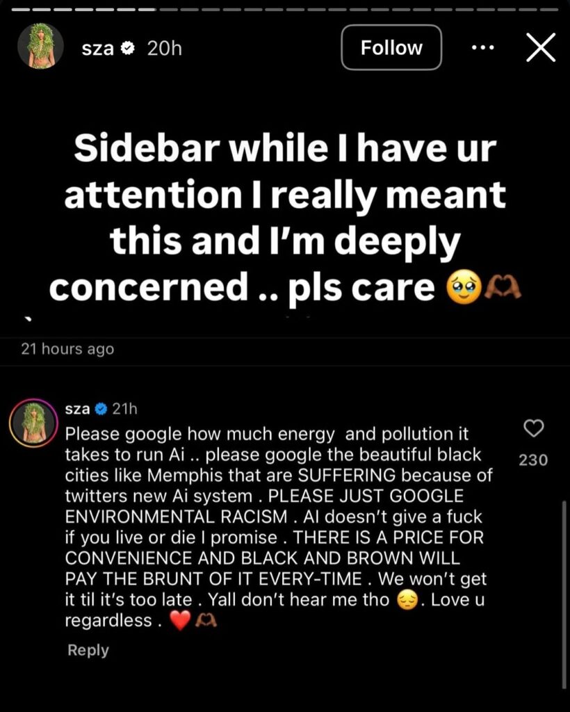 SZA’s post echoes growing concerns among environmental justice advocates who argue that the energy demands of AI technologies — particularly those powering large data centers — are accelerating climate degradation and disproportionately impacting low-income, minority communities. In cities like Memphis, local activists have raised alarms about air and water pollution, increased power consumption, and infrastructure strain tied to new AI and tech developments.
