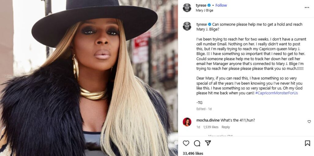 “Can someone please help me to get a hold and reach Mary J. Blige?” Tyrese wrote. “I really didn’t want to post this, but I’m really trying to reach my Capricorn queen… I have something so, so very special for us.”