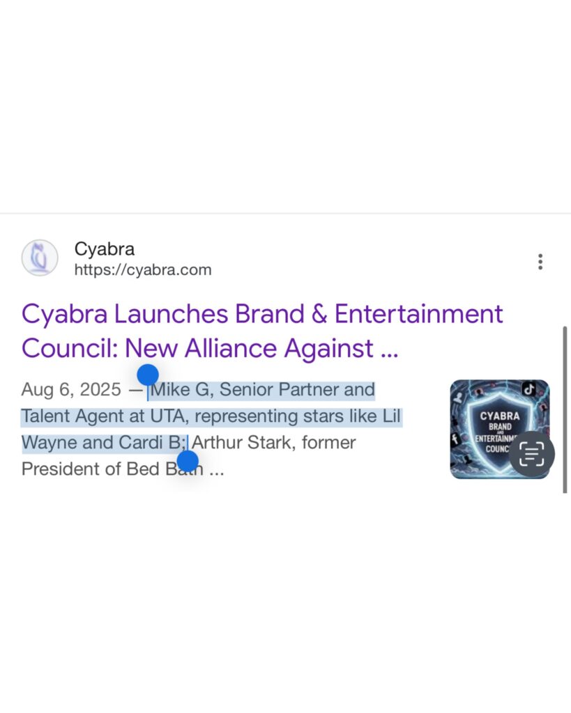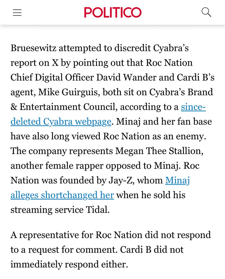 Bruesewitz shared what he described as receipts from Cyabra’s website, highlighting a page that listed “Mike G, Senior Partner and Talent Agent at UTA, representing stars like Lil Wayne and Cardi B,” alongside other business figures. He used that information to suggest a link between Cardi B’s representation and the analytics company cited in the Politico report. Following the online exchange, the referenced webpage was taken down.