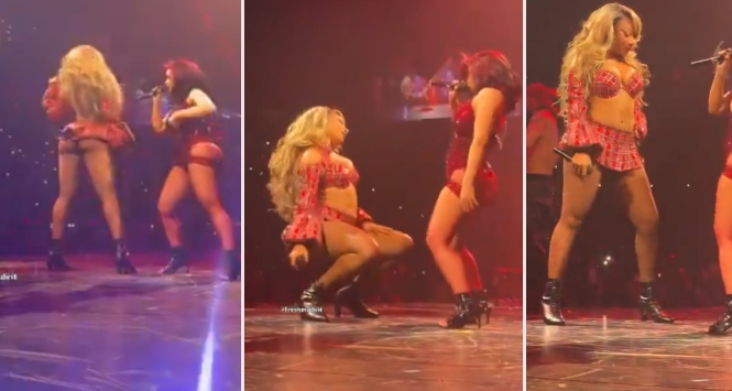 Moments later, Megan appeared dramatically through a trap door in the stage floor. Dressed in a sparkly tartan mini skirt and a matching long-sleeve bikini top, the Houston rapper jumped right into her verse as the crowd shouted along to the lyrics. The surprise entrance intensified the excitement inside the arena, with fans cheering loudly as the two artists performed together.