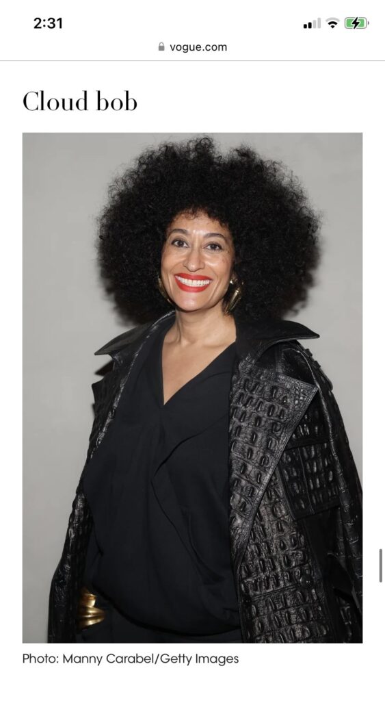 In the piece, the editor described the look as a soft, airy, rounded cut with volume and natural texture. The article featured images of Tracee Ellis Ross wearing styles widely recognized as classic afros but did not reference the hairstyle’s cultural background or historical roots.