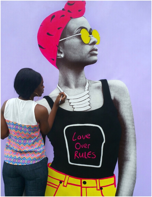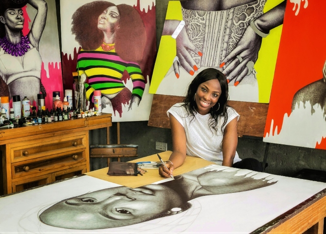 Her bold, Afro-urban aesthetic fuses detailed monochrome illustrations with vibrant performance and fashion elements.